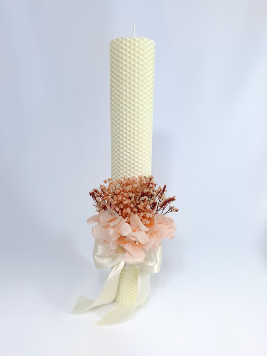 Lumanare Botez din ceara naturala decorata cu hortensie criogenata si flori criogenate/uscate, H35/D5 cm.