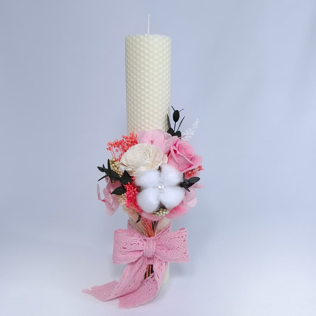 Lumanare Botez din ceara naturala de albine, decorata cu trandafir criogenat, floare de bumbac si flori criogenate/uscate