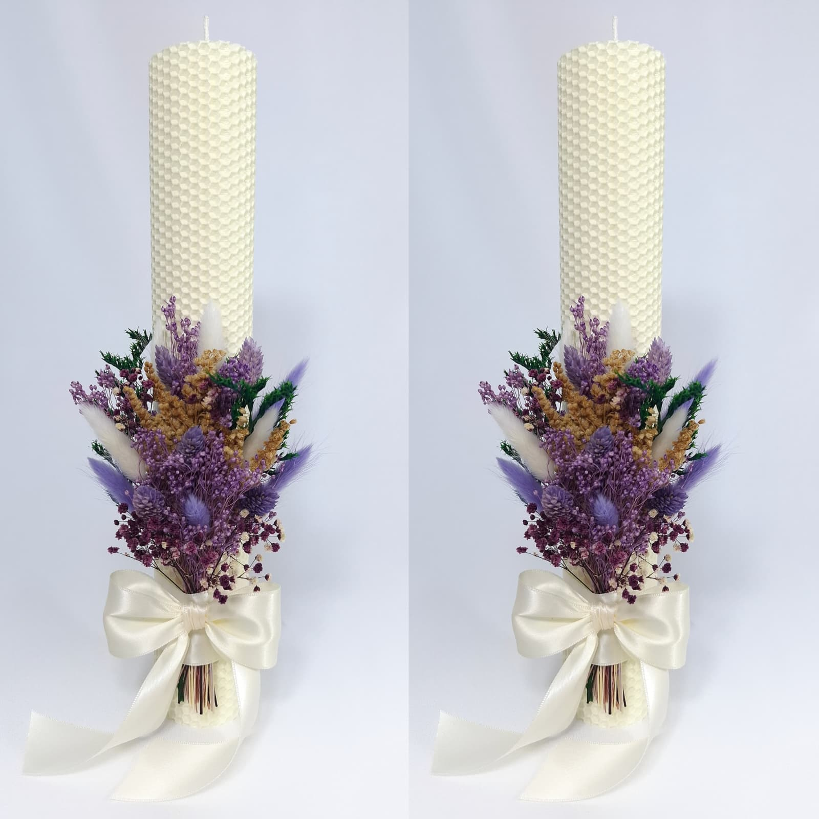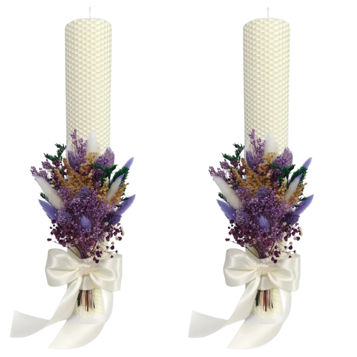 Lumanari nunta/cununie din ceara naturala, decorate cu flori criogenate si uscate, H35/D5 cm.