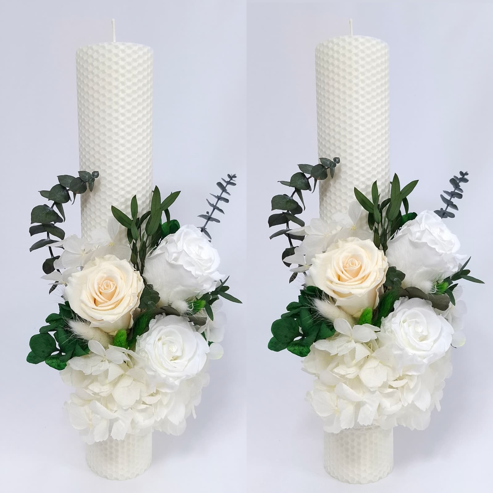 Lumanari nunta/cununie din ceara naturala, decorate cu trandafiri naturali criogenati,eucalipt criogenat si flori naturale criogenate H35/D6 cm