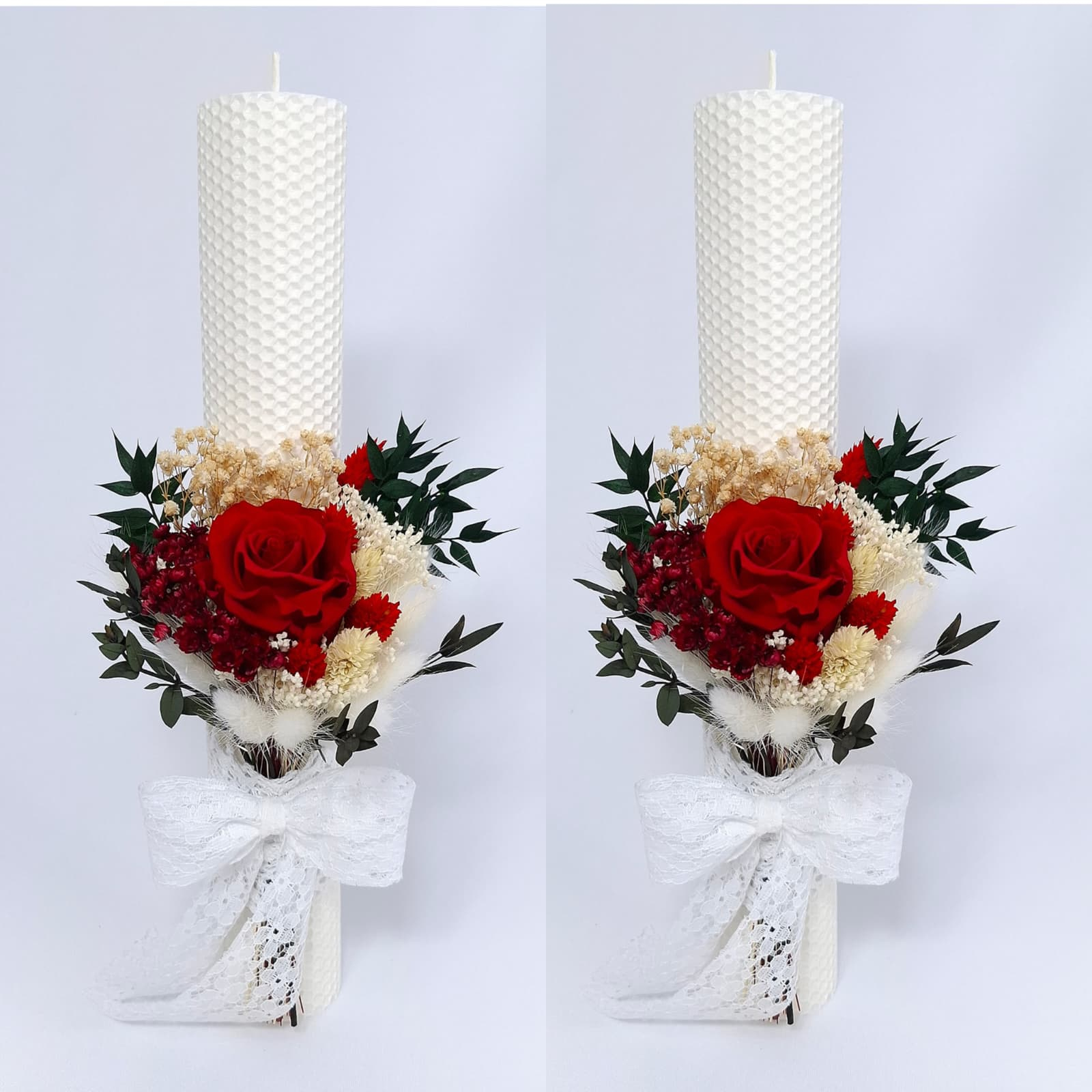 Lumanari nunta/cununie din ceara naturala, decorate cu trandafiri naturali criogenati,gypsophila criogenata si flori naturale criogenate/uscate H35/D5 cm.