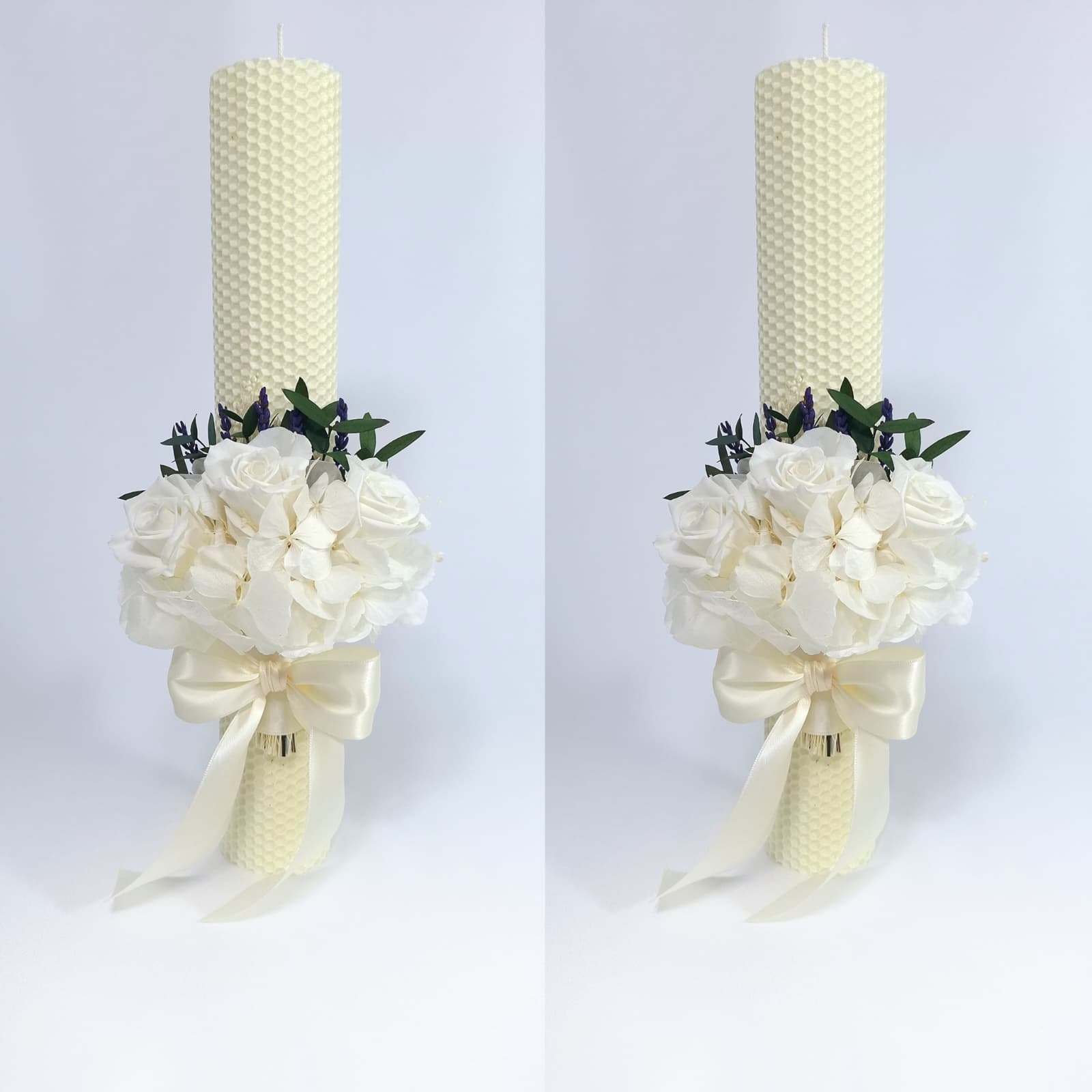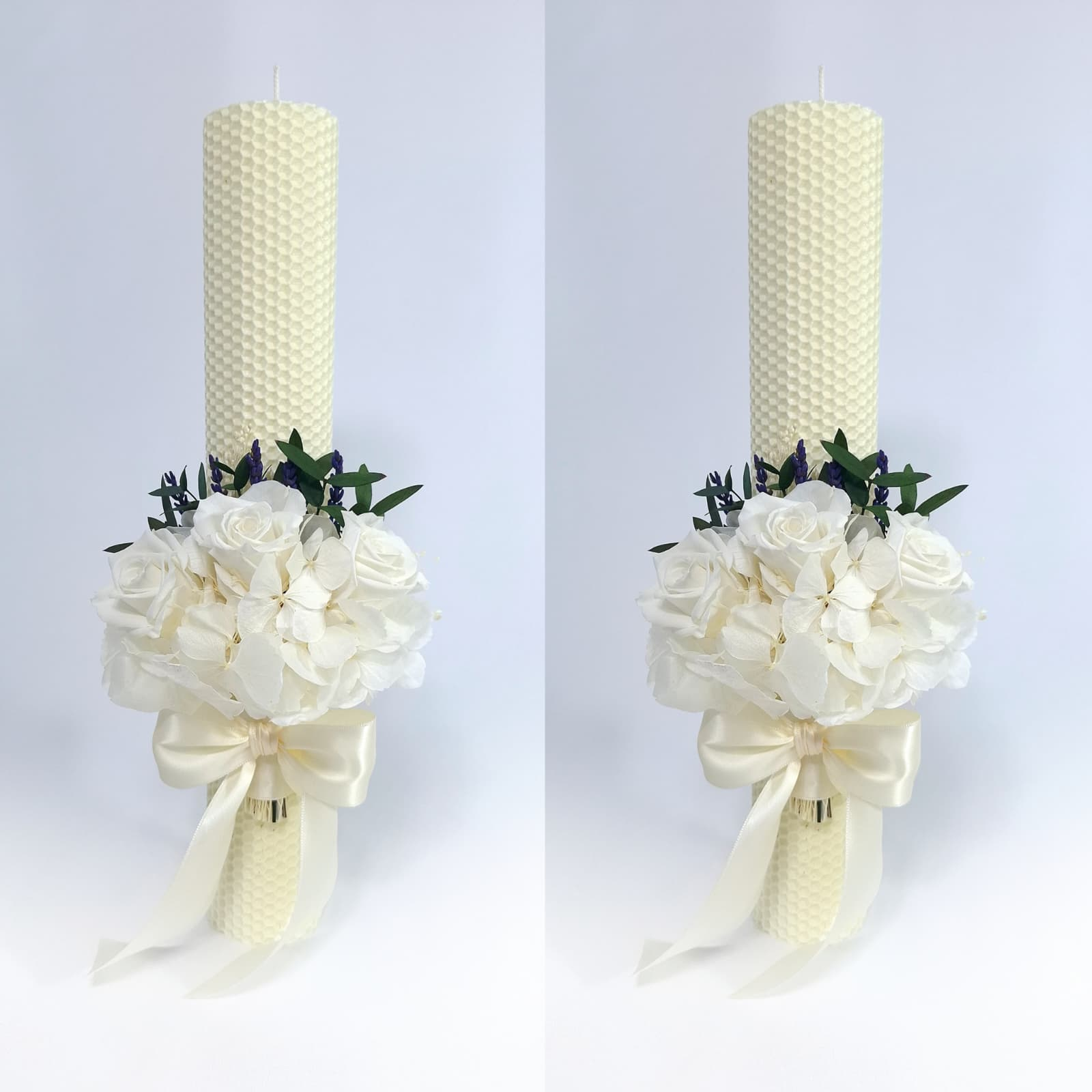 Lumanari nunta/cununie din ceara naturala,decorate cu trandafiri naturali criogenati si hortensie criogenata, H35/D5 cm.