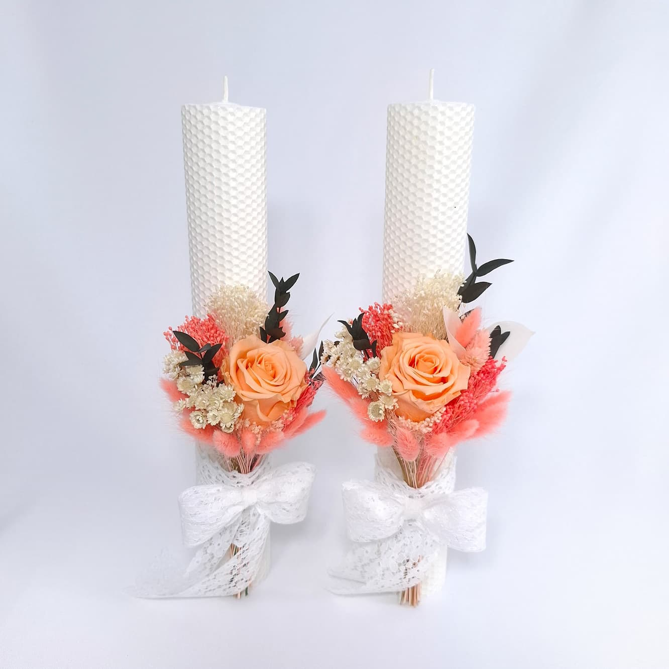Set 2 lumanari cununie/nunta din ceara naturala, decorate cu trandafir criogenat si flori naturale uscate/criogenate, H35/D5 cm
