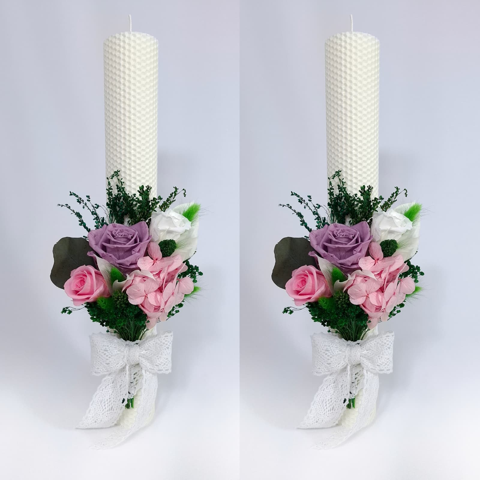 Lumanarile sunt decorate manual cu flori criogenate si uscate: