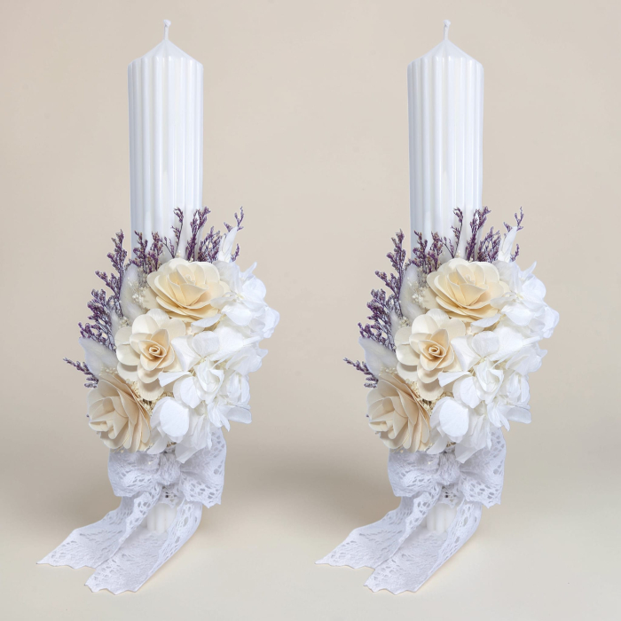 Lumanarile sunt decorate manual cu flori criogenate si uscate: