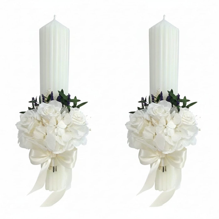 Colecția noastră de lumânări de nuntă și cununie reunește eleganța florilor criogenate cu măiestria lucrului manual. Fiecare pereche de lumânări este concepută pentru a aduce un plus de rafinament momentului vostru special, fiind personalizată în funcție de tematica nunții. Fiind realizate cu flori care nu se ofilesc, acestea vor rămâne o amintire superbă peste ani.