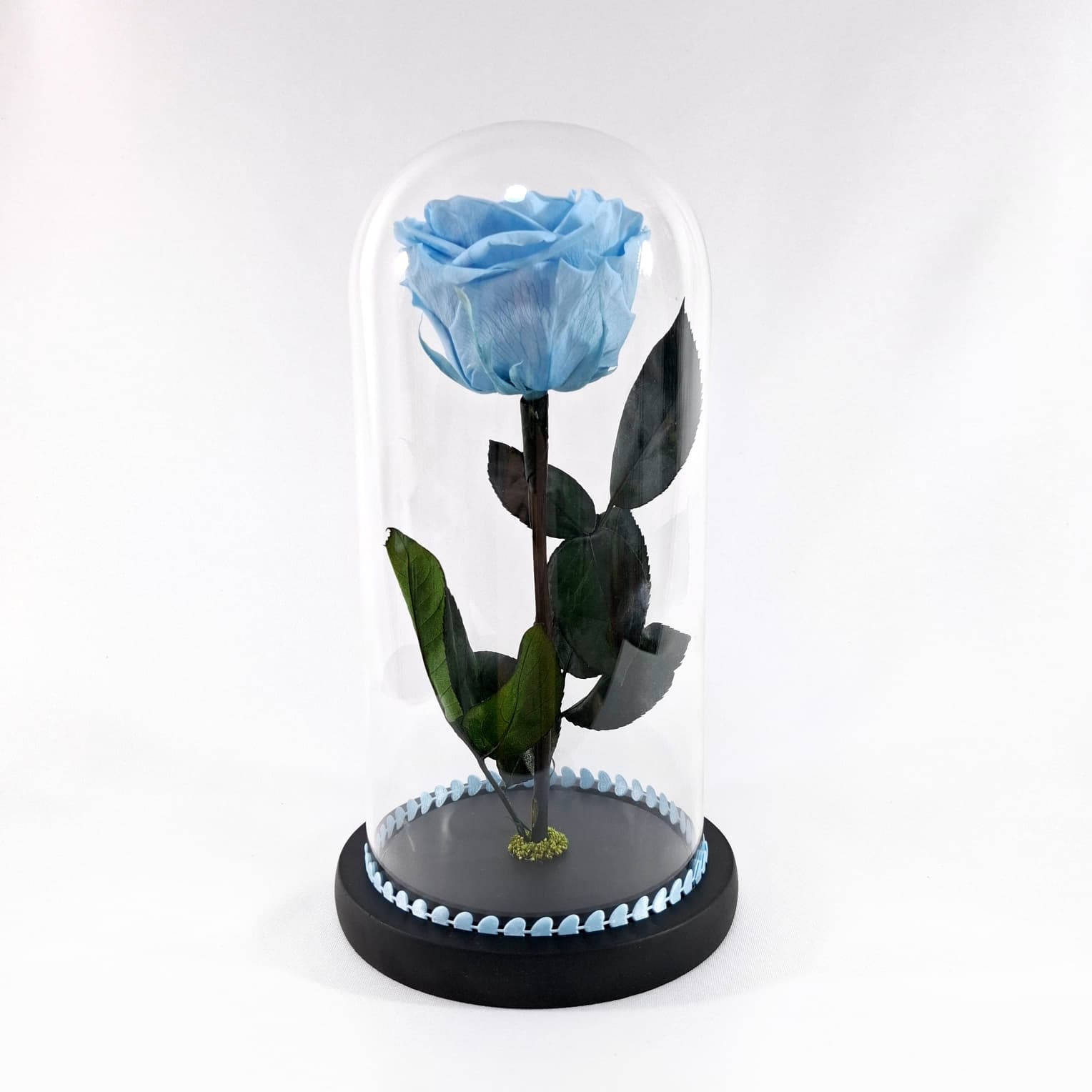 Trandafir criogenat Premium albastru deschis(∅8cm) in cupola de sticla(∅12,H25cm),pe blat din lemn de culoare neagra.