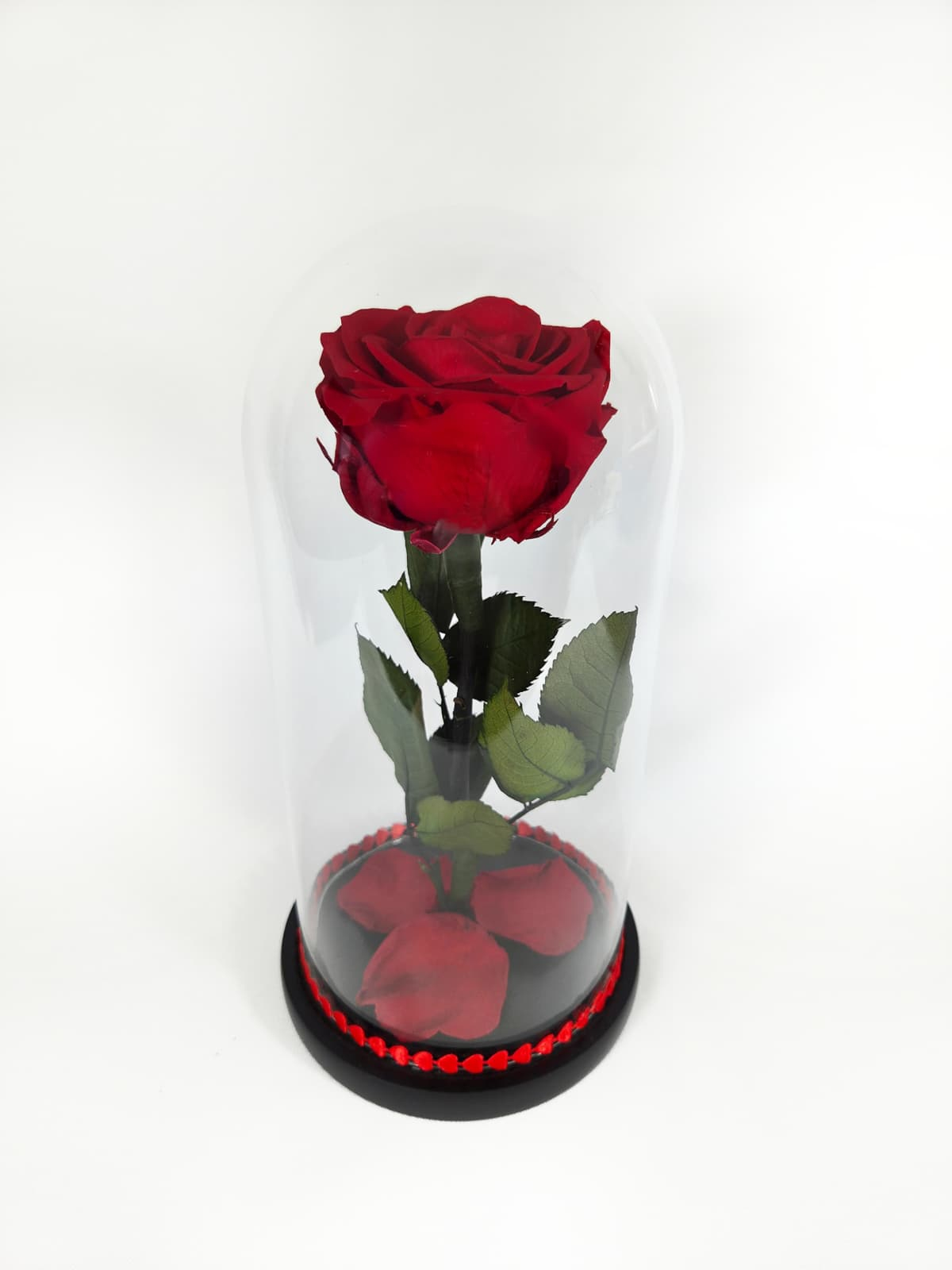 Acest trandafir unic, ales cu grija si supus unei transformari delicate, isi pastreaza aspectul proaspat si incantator ani la rand, fara a avea nevoie de apa sau lumina speciala. Este simbolul perfectiunii eterne, un dar al iubirii care nu se vestejeste niciodata, si o marturie a frumusetii ce transcende timpul. Trandafirul criogenat nu este doar o floare, ci o experienta vizuala si emotionala, o poveste de dragoste conservata pentru a bucura sufletul in fiecare zi.Plasat sub o cupola de sticla eleganta, acest trandafir reprezinta o expresie rafinata a elegantei si a luxului, fiind cadoul ideal pentru orice ocazie speciala.