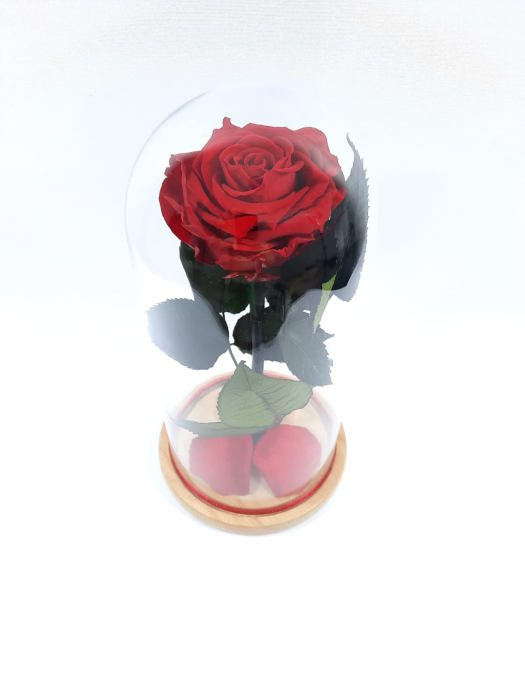 Acest trandafir unic, ales cu grija si supus unei transformari delicate, isi pastreaza aspectul proaspat si incantator ani la rand, fara a avea nevoie de apa sau lumina speciala. Este simbolul perfectiunii eterne, un dar al iubirii care nu se vestejeste niciodata, si o marturie a frumusetii ce transcende timpul. Trandafirul criogenat nu este doar o floare, ci o experienta vizuala si emotionala, o poveste de dragoste conservata pentru a bucura sufletul in fiecare zi.Plasat sub o cupola de sticla eleganta, acest trandafir reprezinta o expresie rafinata a elegantei si a luxului, fiind cadoul ideal pentru orice ocazie speciala.